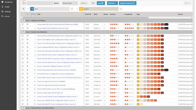 There is currently 190-200 various checks for Oracle and almost 50 controls for MS SQL (depending on version and platform) in following categories: