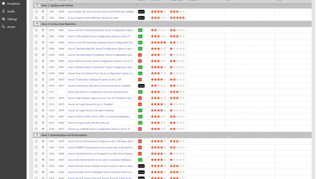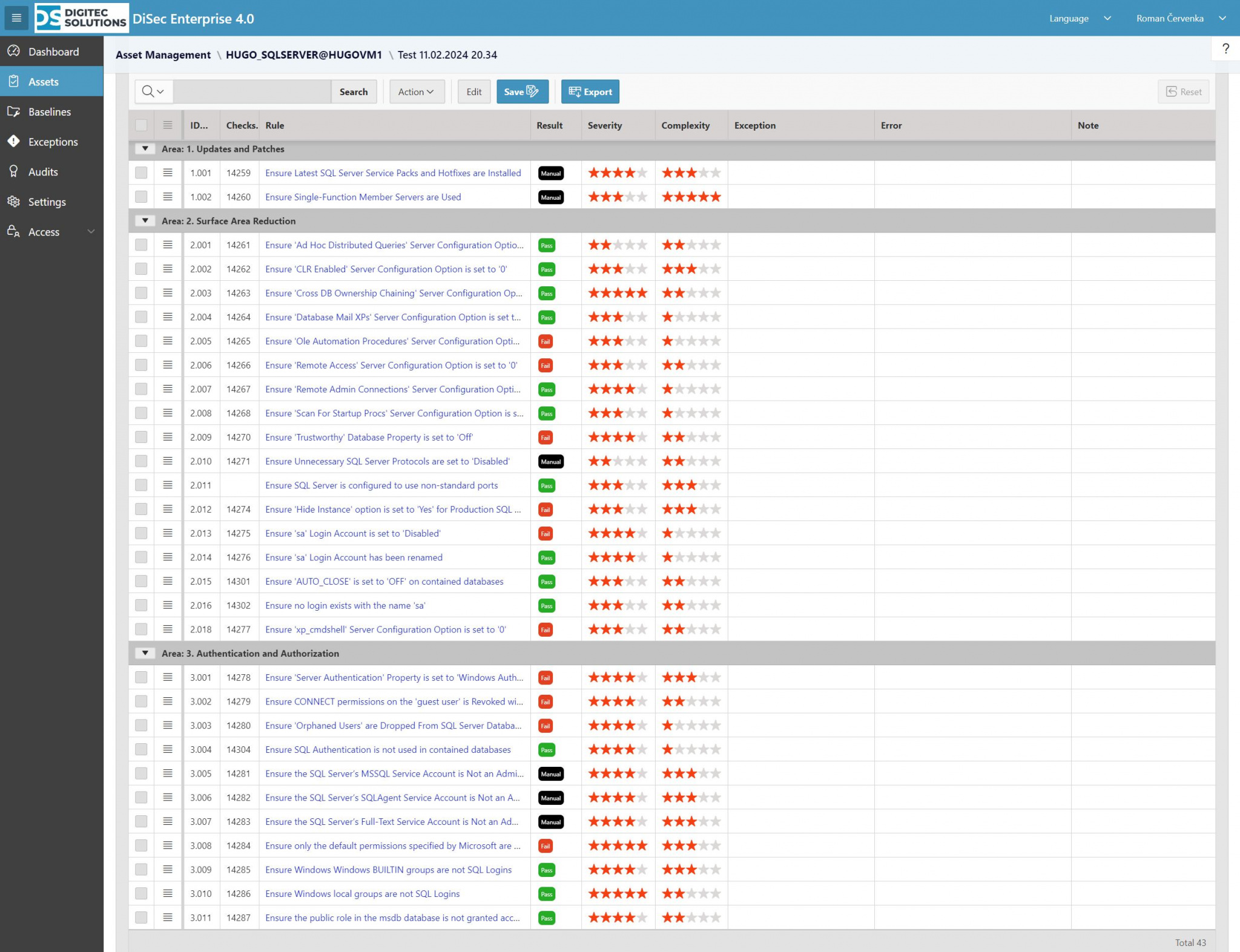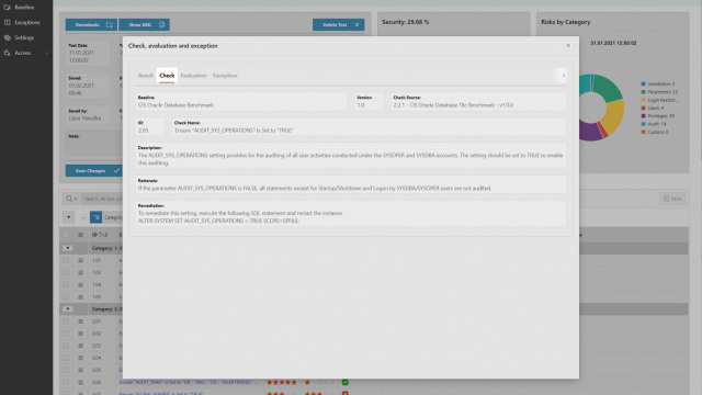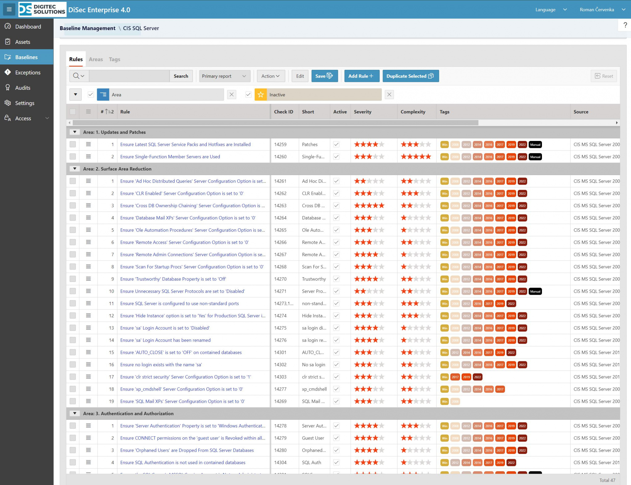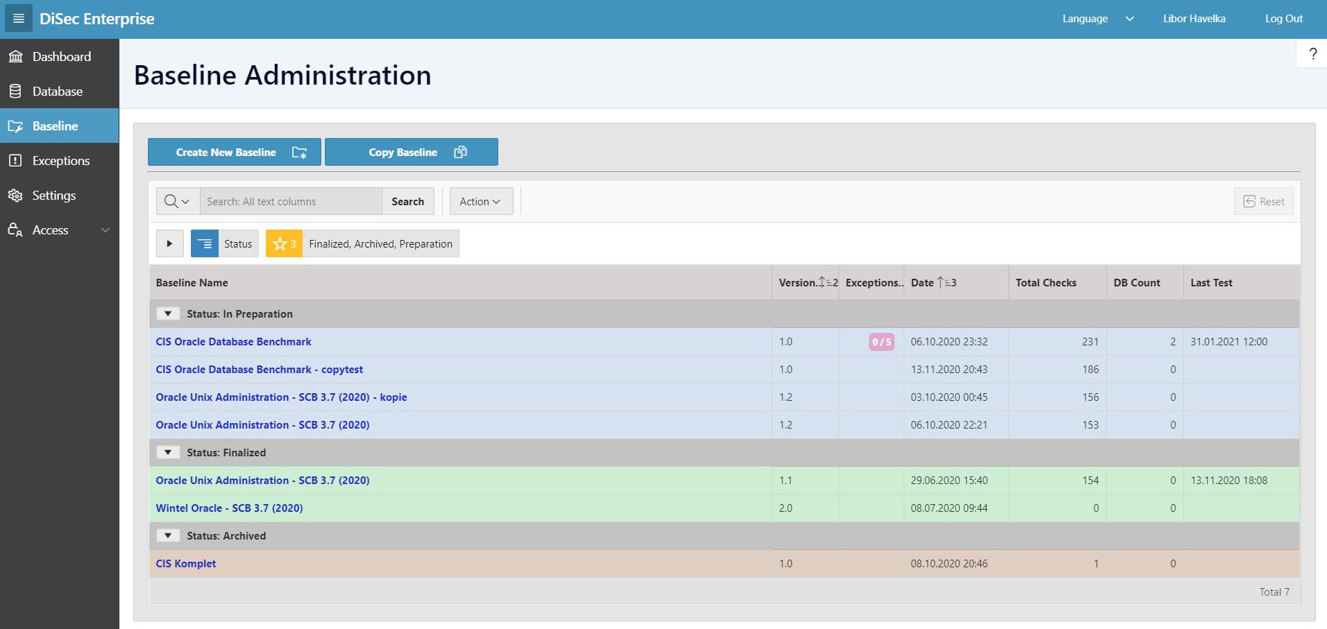V současné době základní baseline obsahuje 190-200 kontrol pro Oracle a skoro 50 kontrol pro MS SQL (v závislosti na verzi a platformě) rozdělených do těchto kategorií: