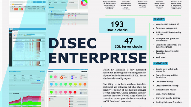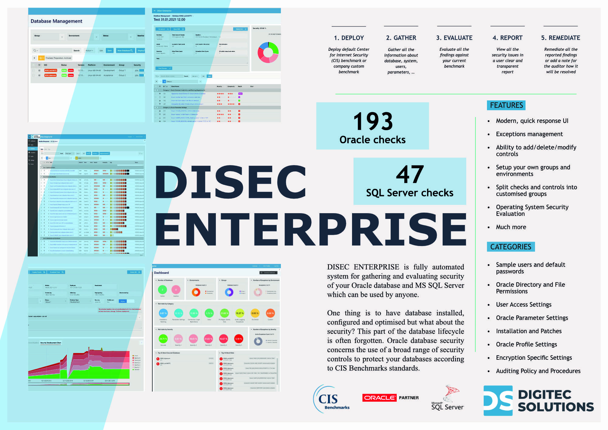 DISEC ENTERPRISE je plně automatický systém na vyhodnocení bezpečnosti vašich databází. A to jak ORACLE tak i MS SQL. Byl vyvinut tak aby ho mohl použít úplně každý.